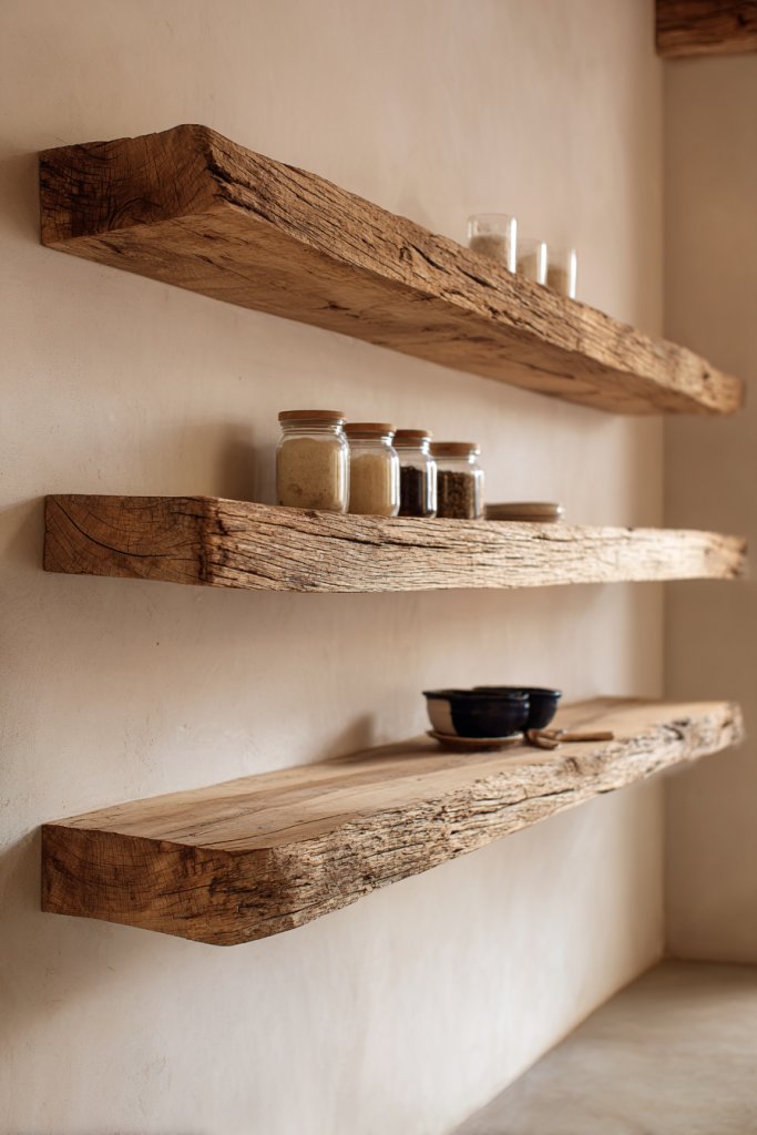 Imagine shelves crafted from unfinished or lightly stained wood, with visible grain and knots. They hold everyday essentials—pots, bowls, and simple glass jars—without feeling overwhelming. The natural imperfections and raw edges add character and authenticity. Light bounces off the textured wood, warming the space and making it feel inviting.