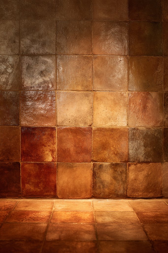Picture terracotta or pebble mosaics laid in warm browns, beiges, and rust hues. The textured surfaces evoke a natural landscape or sandy beach, inviting tactile exploration. The irregular edges of handcrafted tiles add an artisanal charm, making each installation unique. Soft lighting enhances these textures, creating a cozy, earthy glow.