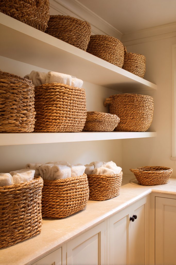 Picture jute, seagrass, or rattan baskets filled with fresh fruit or neatly folded towels. Their warm, tactile surfaces contrast beautifully with smooth ceramic or stone surfaces. Visible weaving patterns and natural fibers add depth and interest. Baskets in various sizes can be stacked or nested, creating a layered, cozy look. Their imperfect shapes and textures enhance the organic vibe.