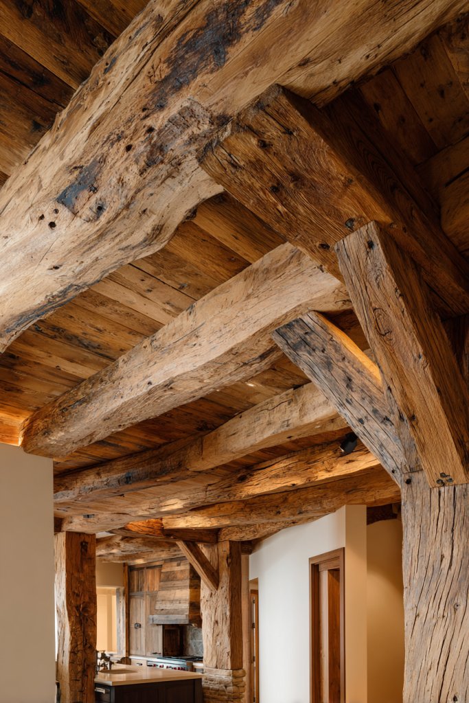 Decorate beams with subtle lighting, such as LED strips or sconces, to highlight their texture. Add vintage or handcrafted fixtures beneath for cohesion. Integrate other natural elements, like stone or clay, to complement the wood. Keep the overall look simple and organic—avoid overly polished finishes or excessive ornamentation.