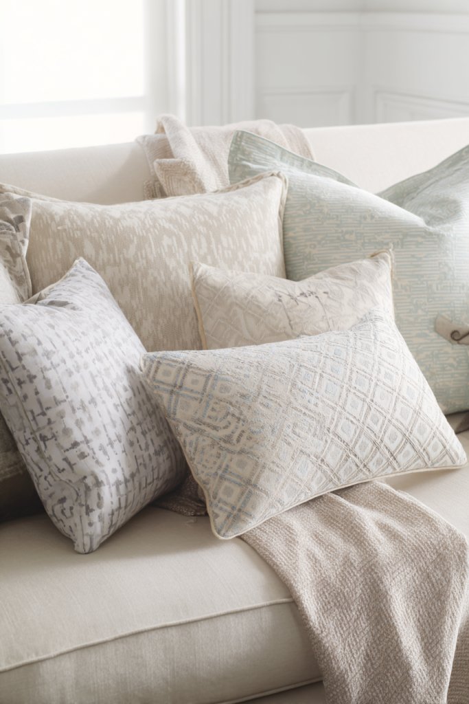 Visualize a sofa adorned with a mix of textured cushions in neutral tones, accented with pillows featuring delicate chevrons, herringbone, or damask patterns. The patterns add a layer of depth, while the textures—like woven, velvet, or embroidered fabrics—invite touch. These pillows become focal points, complementing your furniture and tying together your decor palette. The overall vibe is refined, layered, and inviting.