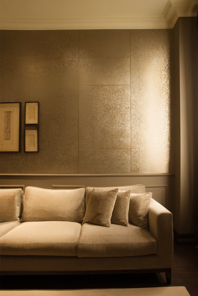 Visualize a wall covered in a soft, silk-like fabric or a delicate embossed wallpaper in muted tones. The subtle textures catch the light differently throughout the day, creating a dynamic, layered effect. Pair this wall with sleek furniture, metallic accents, and plush textiles for a cohesive, refined look. The textured surface adds visual richness without overwhelming the senses, making your living room feel intimate and sophisticated.
