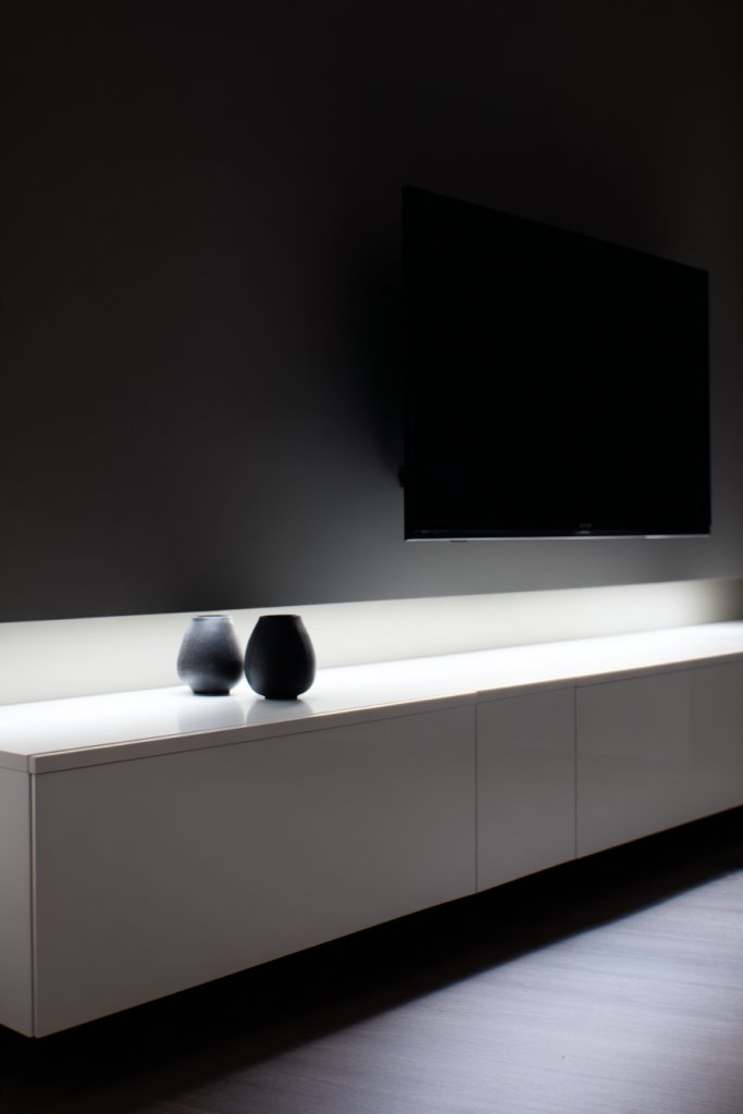 Imagine a low-profile, matte black or polished wood console with clean lines and hidden storage compartments. It seamlessly houses your TV, electronics, and accessories, keeping everything tidy. The smooth surface and minimal hardware emphasize simplicity and luxury. Surround it with plush seating and layered textiles that soften the modern lines, creating a balanced, upscale vibe. The overall scene is sleek, organized, and inviting.
