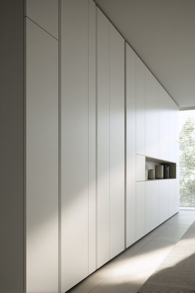 Imagine a seamless wall where cabinetry flows from floor to ceiling, with soft-close doors hiding away DVDs, remotes, and other clutter. The cabinetry is finished in matte lacquer or rich wood veneer, complementing any modern decor. Soft lighting under the units highlights their clean lines, while a slim, unobtrusive TV sits neatly within the design. It’s a harmonious blend of function and form, making your living space feel both spacious and luxurious.