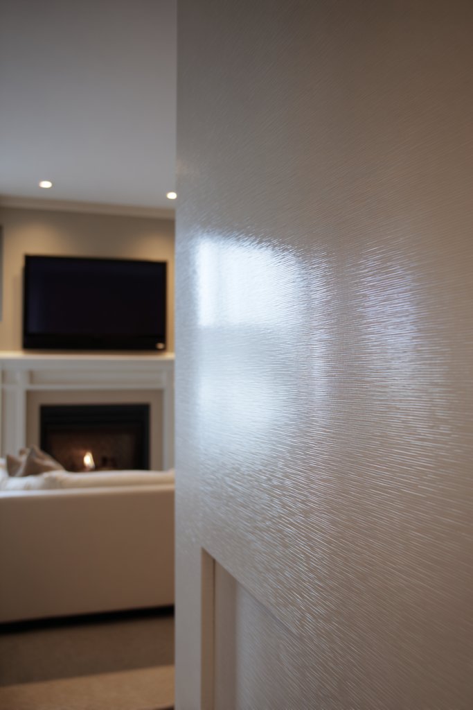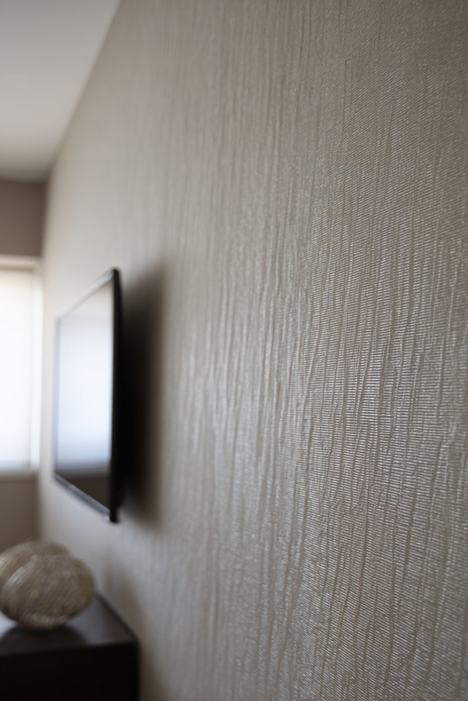 Imagine a wall covered in subtle, neutral-toned textured wallpaper with a tactile pattern—perhaps a linen weave, embossed geometric, or metallic sheen. The texture catches the light at different angles, adding depth without overwhelming the space. Your TV becomes part of a layered scene, with the textured backdrop bringing warmth and sophistication. It’s like giving your wall a subtle, stylish face-lift.
