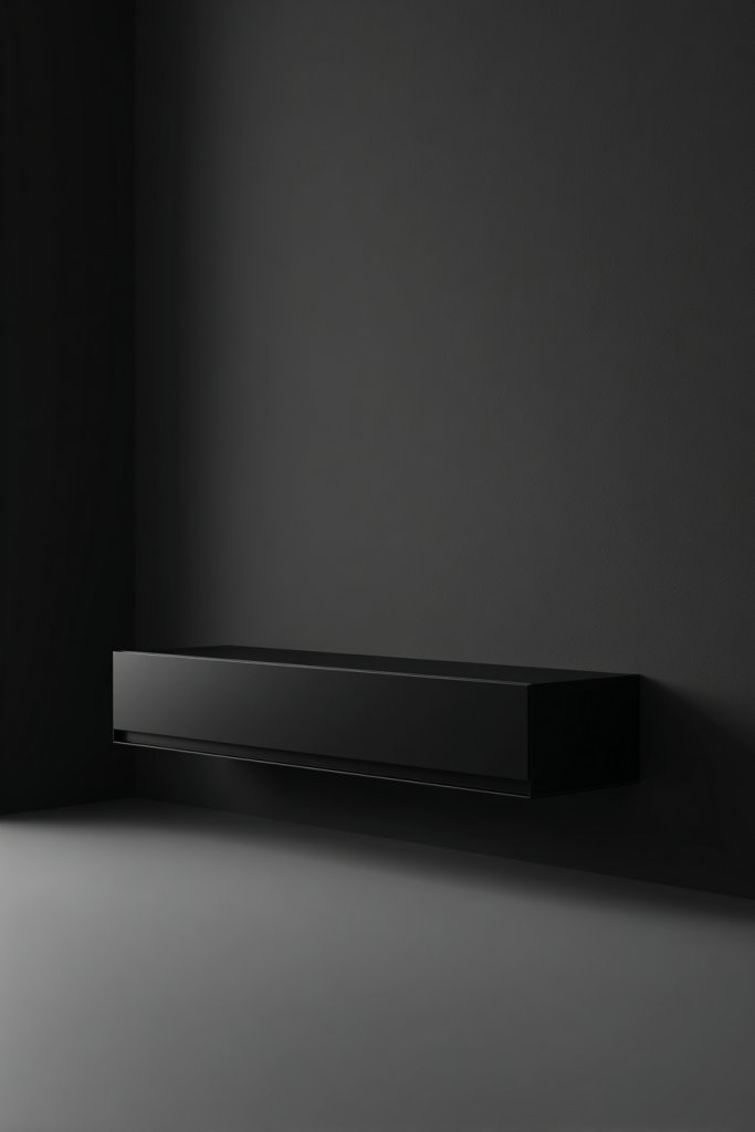 Imagine a slim, matte black console floating just below your TV, with a smooth, solid-colored wall behind it—perhaps in deep navy or soft charcoal. The minimalist design features clean lines and no bulky legs, emphasizing a modern aesthetic. Everything is neatly tucked away inside drawers or compartments, while the backdrop’s uniform color amplifies the visual focus on the media setup. It’s a calming, elegant scene that feels intentional and polished.
