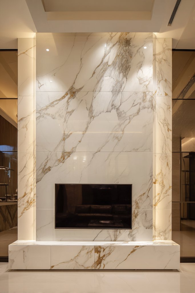 Picture a stunning wall with large slabs of white marble veined with gray, or shimmering quartz in metallic hues. The natural patterns and reflective surfaces catch the light beautifully, adding depth and texture. The marble or quartz extends floor to ceiling, framing the TV like a piece of fine art. The rich, glossy finish adds a sense of grandeur and elegance, transforming your room into a high-end showroom.