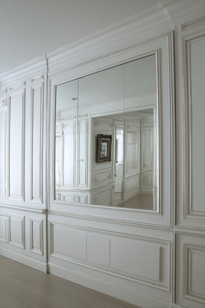 Visualize a large, beautifully framed mirror set into a wall with intricate molding or sleek, modern trim. The mirror reflects your decor and ambient light, creating an illusion of depth. Around it, a decorative frame in gold, black lacquer, or painted wood defines the space, giving it a gallery-like feel. The reflection also softens the overall aesthetic, making the room feel more inviting and airy.