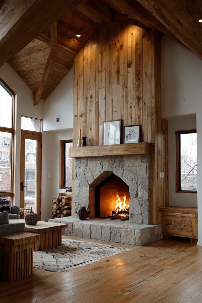 Visualize rich, warm-toned wood planks arranged vertically or horizontally around the fireplace. The grain and knots add texture, while the natural finish enhances the rustic appeal. Complement with a stone hearth or a simple stone surround. Soft lighting highlights the wood’s warmth, making the entire area inviting and snug.