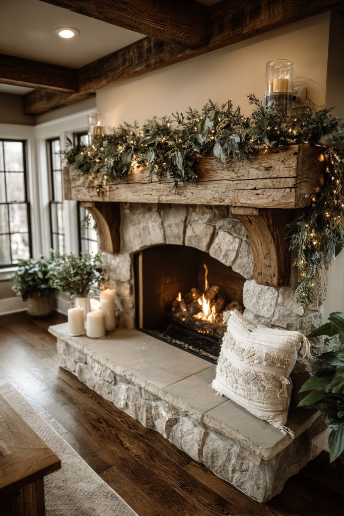 Picture a wide wooden or stone mantel adorned with lush greenery, twinkle lights, or festive ribbons depending on the season. The garlands drape naturally, framing the fire with vibrant colors or natural textures like pinecones and berries. Candles or seasonal ornaments add warmth and personality, making your fireplace the centerpiece of holiday gatherings or cozy nights.
