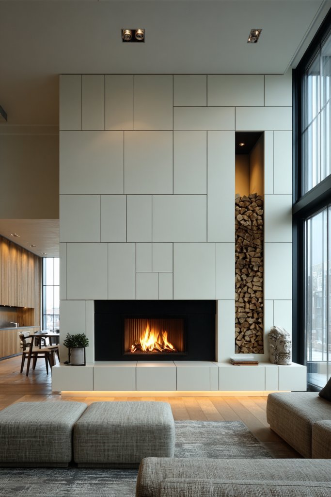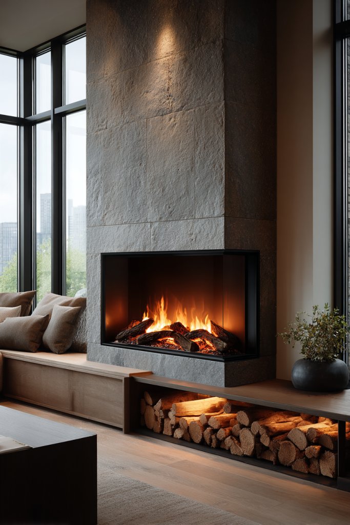 Imagine a built-in wall niche with a sleek, flush-mounted fireplace at its center. Flanking it are seamless cabinets or drawers with push-to-open mechanisms, hiding tools, firewood, or other essentials. The smooth surface and minimal hardware maintain a clutter-free aesthetic. When lit, the fireplace becomes a modern focal point that’s both functional and beautiful.