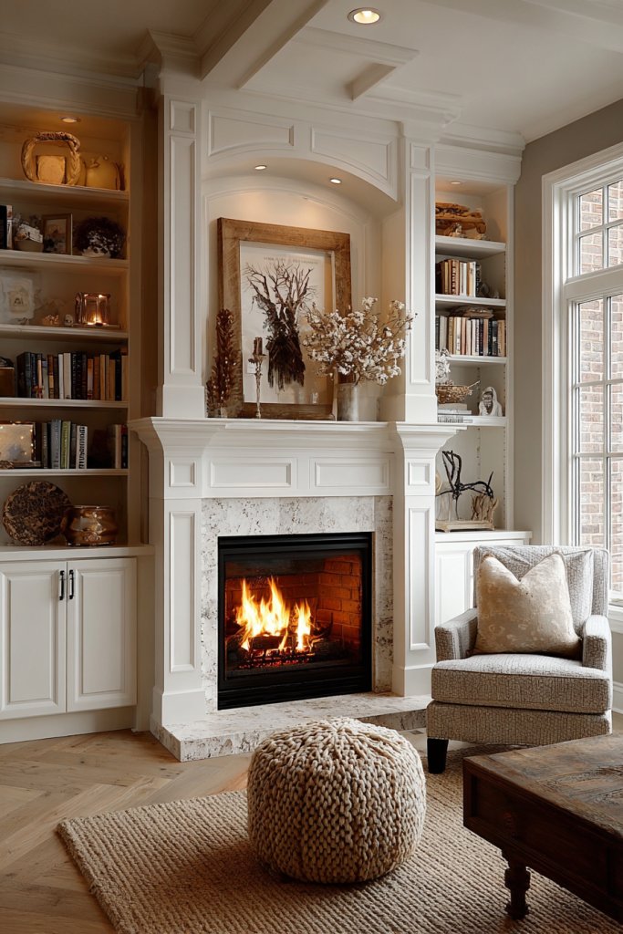 Visualize tall, open shelves on either side of the fireplace, filled with books, decorative boxes, or personal mementos. The hearth becomes a central feature, with a plush armchair or window seat nearby. Soft lighting and textured textiles make it inviting for long reading sessions. The result is a warm, lived-in space that’s both functional and charming.