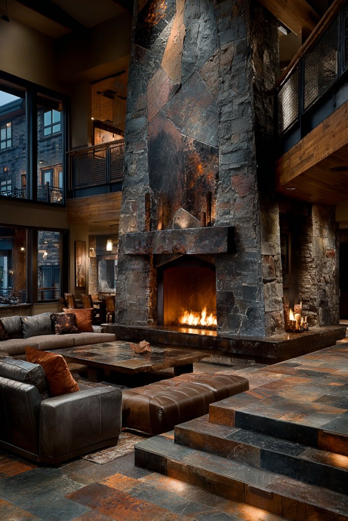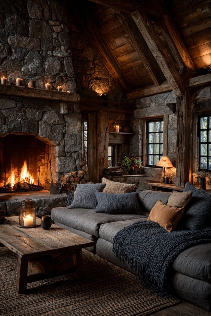 Imagine a rugged, textured stone frame wrapping your fireplace, with earthy tones like warm browns, grays, and hints of moss green. The rough surface catches the light unevenly, creating shadows that dance with the flickering flames. Surround it with chunky wooden beams or a reclaimed wood mantel to enhance the rustic aesthetic. The overall effect is a cozy, cabin-inspired retreat right in your living room.