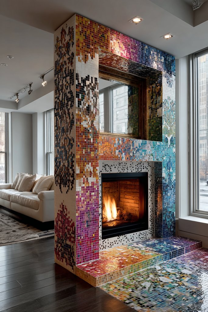 15. Fireplace with a Mosaic Tile Frame for Artistic Flair