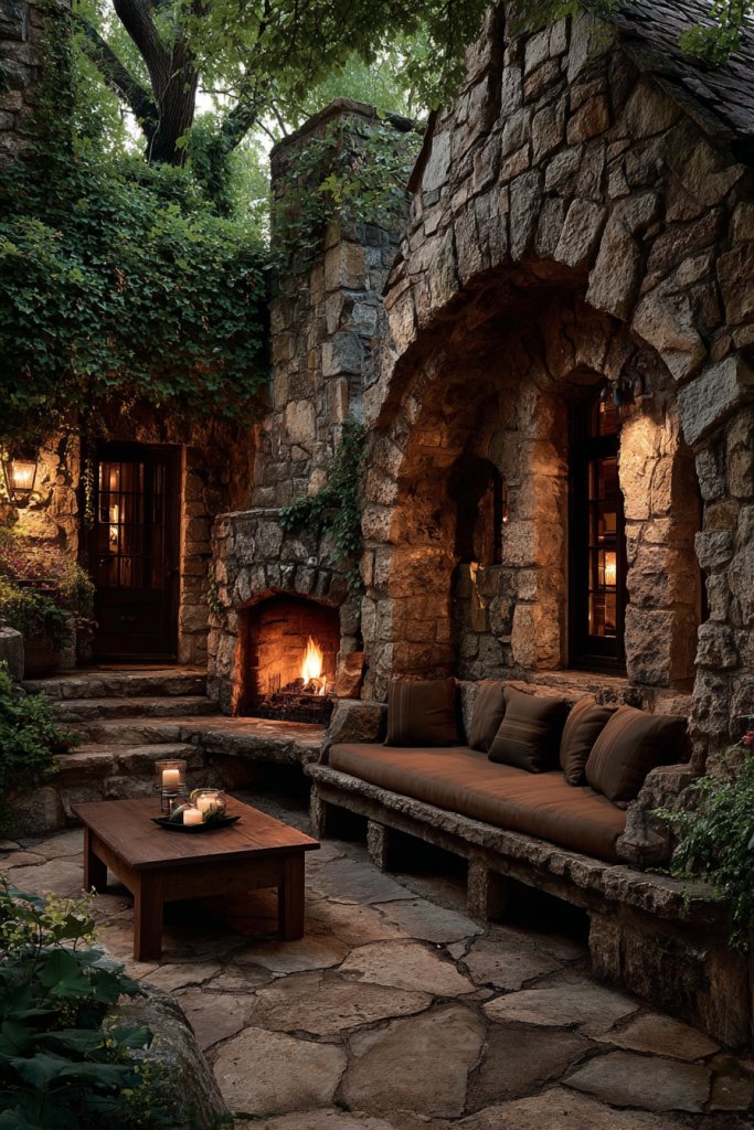 Visualize a stone or brick fireplace built into a garden wall or freestanding structure. Flames flicker against a backdrop of string lights, lush greenery, or outdoor furniture. The hearth is surrounded by comfortable seating, rugs, and tables, making it perfect for dinners or fireside chats under the stars. Ambient lighting softens the space, inviting lingering conversations.