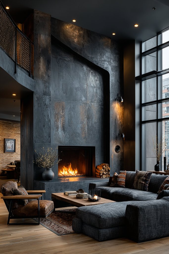 Choose materials like black steel, dark tile, or painted wood for the surround. Pair with light-colored walls and furniture to maximize the dramatic effect. Decorate nearby with metallic or glass accents to reflect light and add sparkle. You can also incorporate textured textiles or soft lighting for a cozy balance.