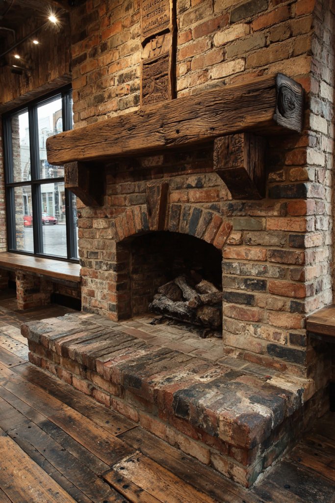 3. Vintage Brick Fireplace with Reclaimed Wood Mantel