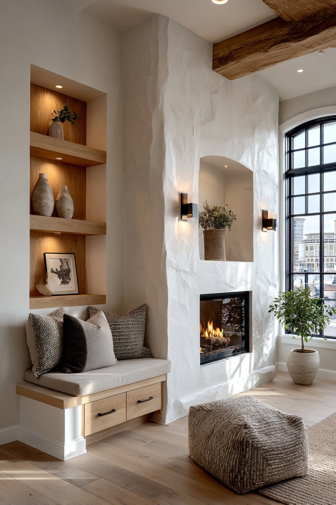 Tired of wasted corner space that collects dust? A corner fireplace with a built-in shelving niche turns an awkward spot into a cozy, functional feature. If your room feels unbalanced or cluttered, this design offers both warmth and storage. Ever wondered how to maximize every inch?