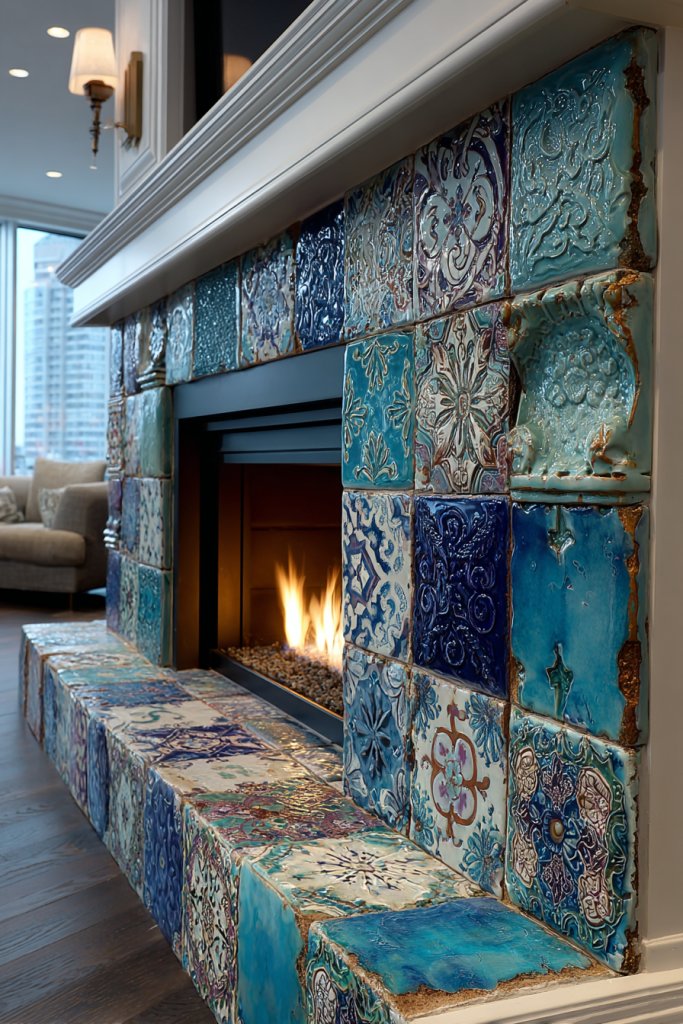 Visualize a fireplace framed with colorful, patterned tiles like Moroccan hexagons or subway tiles with a textured finish. The tiles add depth and contrast, catching light and creating a focal point. The hearth can be tiled with mosaic or geometric patterns, adding a handcrafted feel. The overall look is vibrant, artistic, and full of personality.
