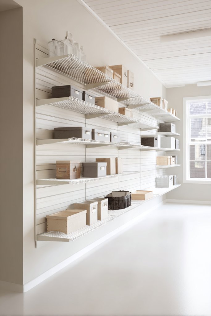 1. Bright and Organized Storage Wall with Adjustable Shelving