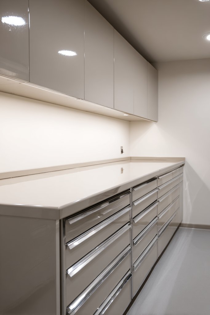 Choose handleless, push-to-open cabinets for a seamless look or incorporate subtle finger pulls for easy access. Use high-gloss or matte finishes in neutral tones to match your garage decor. Incorporate hidden drawers or pull-outs behind larger panels for specialized storage. For added security or aesthetics, opt for touch-latch or magnetic closures. This system adapts to any space, big or small.