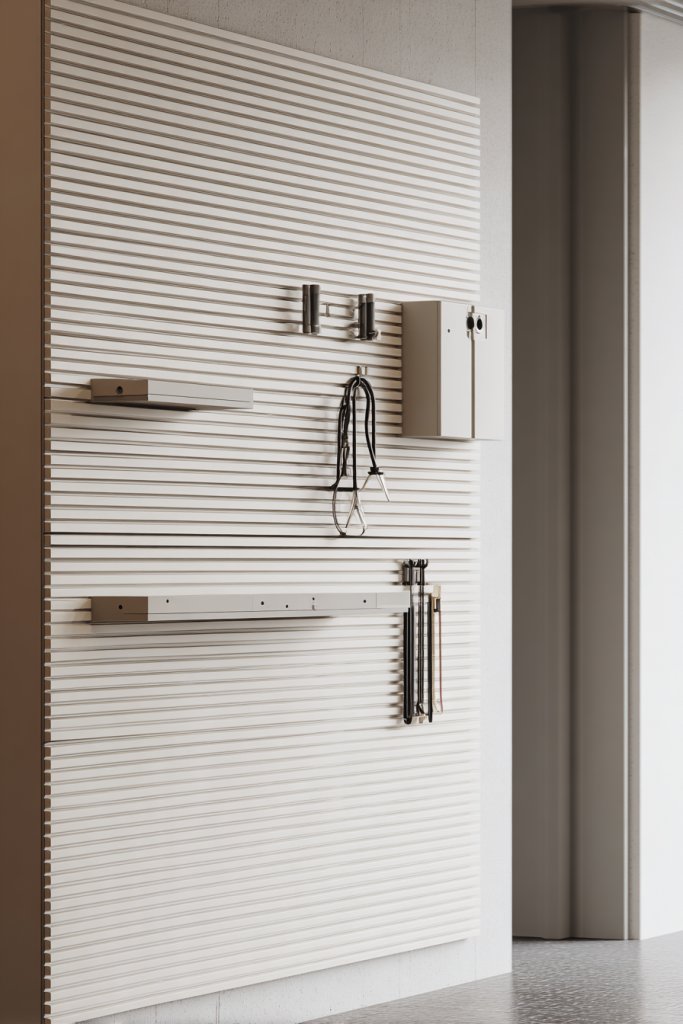 Imagine a sleek, horizontal panel with evenly spaced grooves, painted in a bold or neutral hue. Hooks, baskets, and shelves snap into the grooves, holding everything from hand tools to small parts. The arrangement looks intentional and modern, with a clean, structured appearance. Accessories can be easily moved or swapped, allowing you to change your setup as your needs evolve.