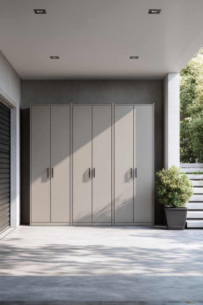 Add subtle lighting inside the hidden compartments for visibility. Customize with paint or veneer to match your overall garage style. Incorporate a few decorative elements on the visible panels, like textured finishes or subtle patterns, to add interest. Use magnetic or push-to-open hardware to minimize visual clutter and keep everything sleek.
