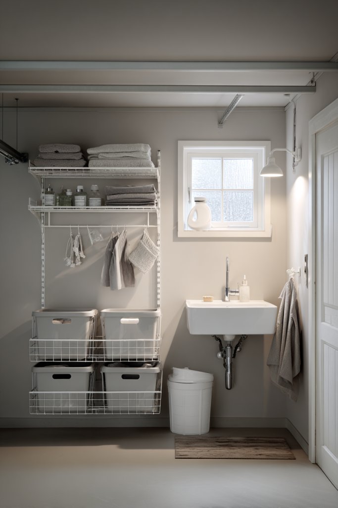 Imagine a bright, tidy nook with a compact washer and dryer stacked or side-by-side. Shelves above hold detergent, fabric softeners, and cleaning tools, all labeled and in easy reach. A folding station with a smooth countertop provides space for sorting clothes. Bright LED lighting enhances visibility, while colorful storage bins add a cheerful touch. The entire space looks clean, organized, and inviting, making laundry less of a chore.