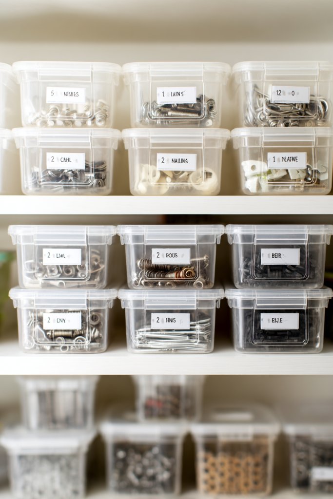 Visualize a series of transparent containers stacked or lined up on shelves, each filled with nuts, bolts, or washers. Bright labels indicate contents, making it quick to identify what you need. The clear plastic allows you to see at a glance if supplies are running low. The overall setup looks tidy and professional, turning your garage into an organized workshop.
