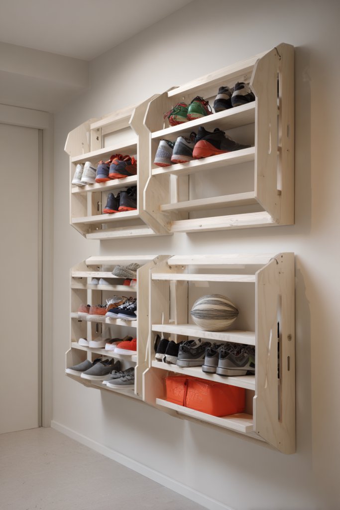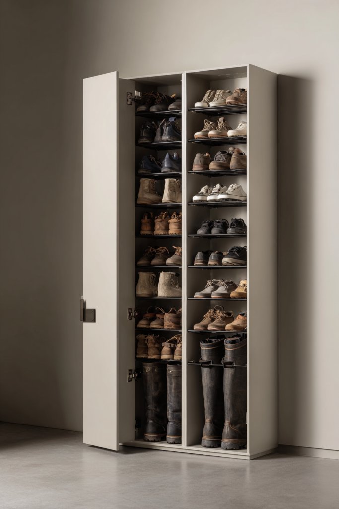 Visualize a tall, slim cabinet with multiple cubbies, each tailored for different shoe sizes or types. The doors are sleek, with a matte finish, possibly in a color that complements your overall garage decor. Inside, shoes are arranged neatly, with some cabinets featuring pull-out trays or angled shelves for easy visibility. The cabinet’s design minimizes clutter while adding a modern touch to your garage environment.