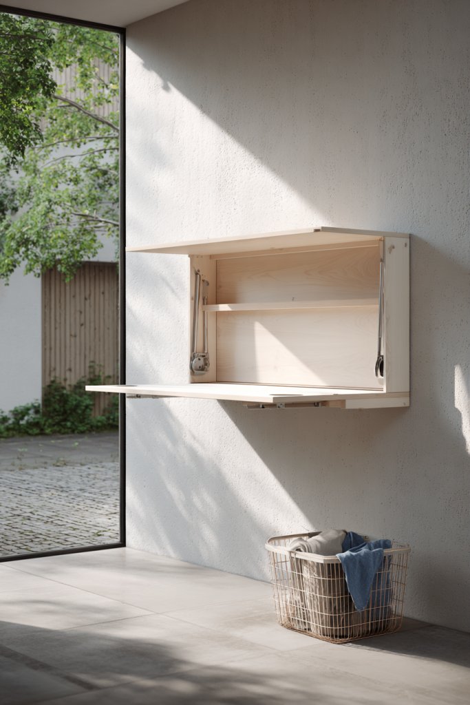 Choose a fold-down table in a neutral wood tone for a classic look, or go bold with bright colors to energize your workspace. You can add a foldable stool or chair that stows away inside a nearby cabinet. The table’s size can vary from small, compact units for quick fixes to larger surfaces for detailed projects. For seasonal needs, consider adding a removable cover or mat to protect the surface.