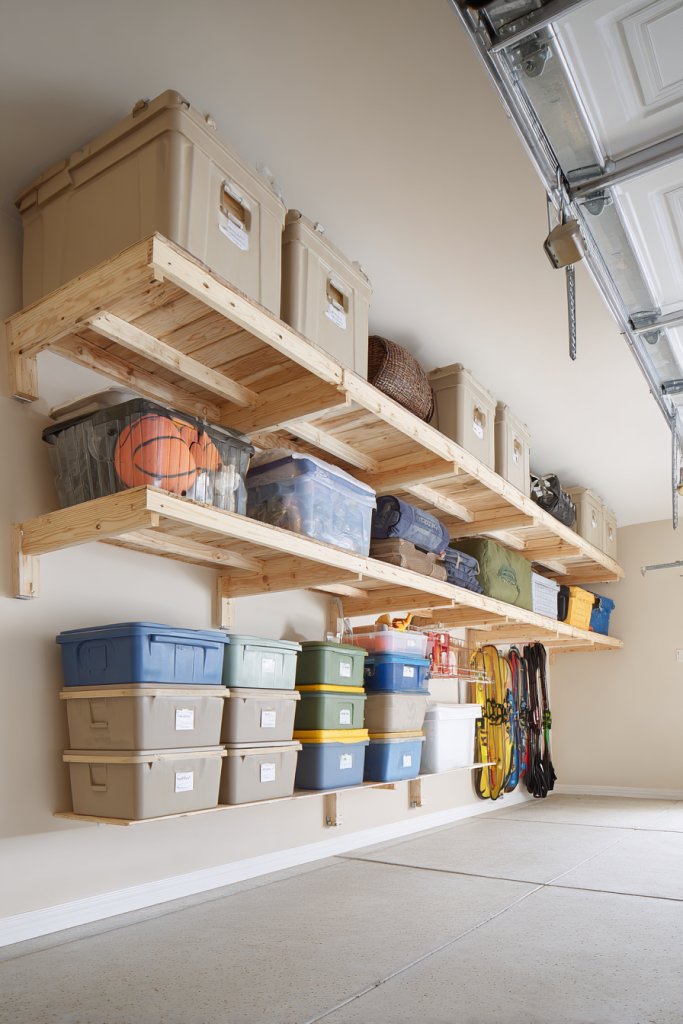 Use wire shelving for a lightweight, adjustable solution or solid wooden platforms for heavier loads. Incorporate color-coded bins to quickly identify seasonal contents. For smaller items, add labeled containers or hooks underneath the platforms. This system adapts well to different garage heights and ceiling configurations, and can be expanded easily as your needs grow.