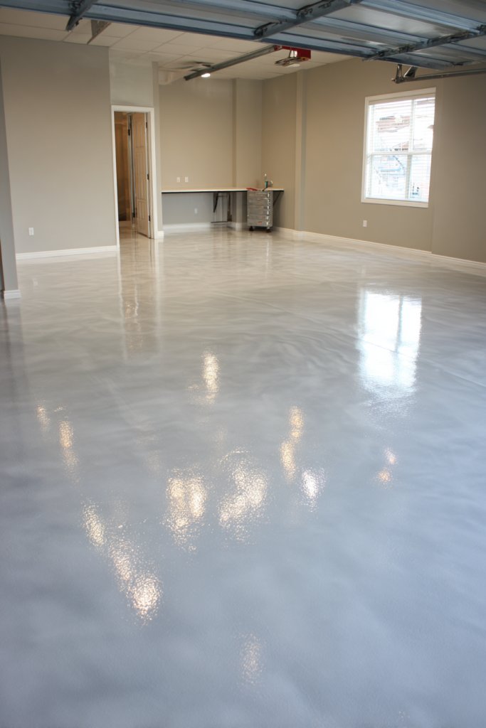 Imagine a glossy, high-shine surface that reflects light and instantly brightens the entire space. The epoxy’s smooth finish hides minor imperfections and stains, while vibrant colors or metallic finishes create a modern, eye-catching look. The seamless surface feels soft underfoot but tough enough to withstand daily wear and tear. It’s like giving your garage a facelift with a professional-grade, stylish coating.