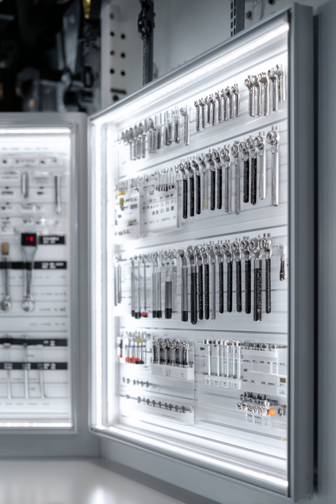 Opt for a minimalist look with monochrome hooks and labels or go vibrant with contrasting colors. You can choose magnetic strips for quick access or individual hooks for heavier tools. Modular panels allow you to customize the layout, adding or removing sections as your collection grows or shifts. For more delicate tools, incorporate foam or padded slots for extra protection.