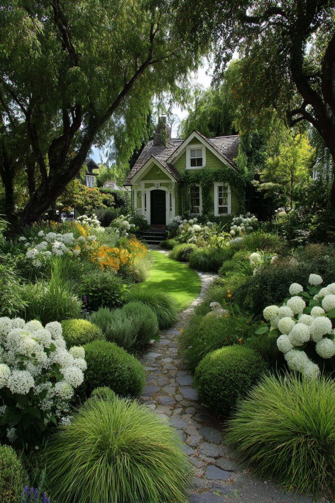 Picture matching flower beds on either side of the front walkway, with identical shrubs and small trees. Symmetrical window placements paired with evenly spaced pathway stones create visual harmony. The balance in landscaping complements architectural features, framing the house beautifully. It’s all about creating a mirror image that feels natural, not forced.