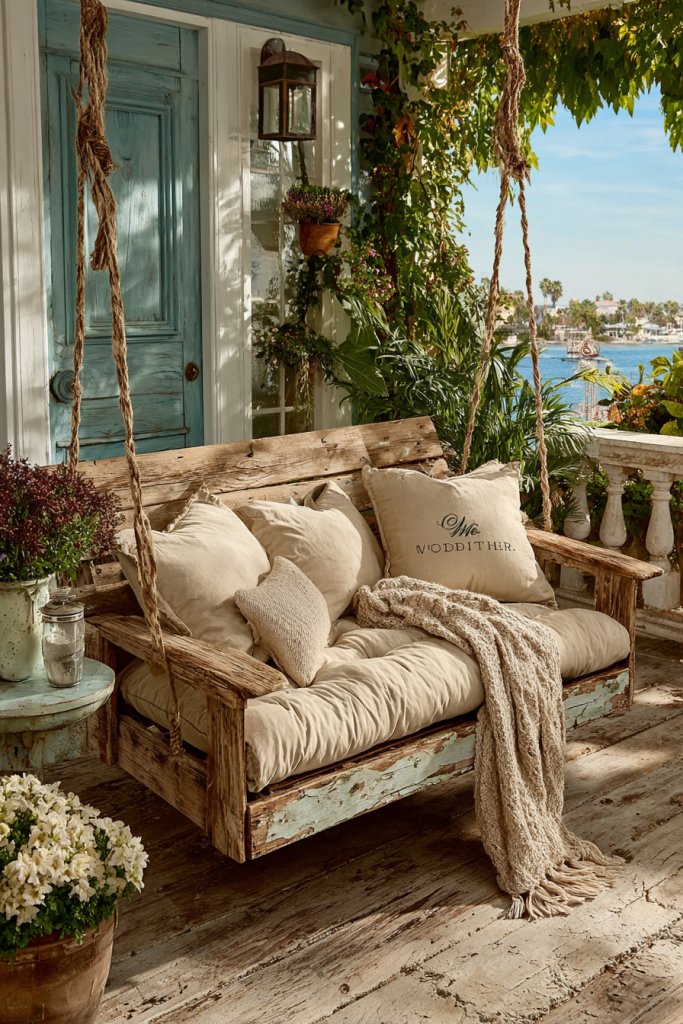 Imagine a vintage swing suspended from a sturdy porch ceiling, with plush cushions and a throw blanket. Or picture a quaint corner with a weathered wooden bench surrounded by potted plants and lanterns. The inviting setup makes your home feel warm and approachable, encouraging visitors to linger.