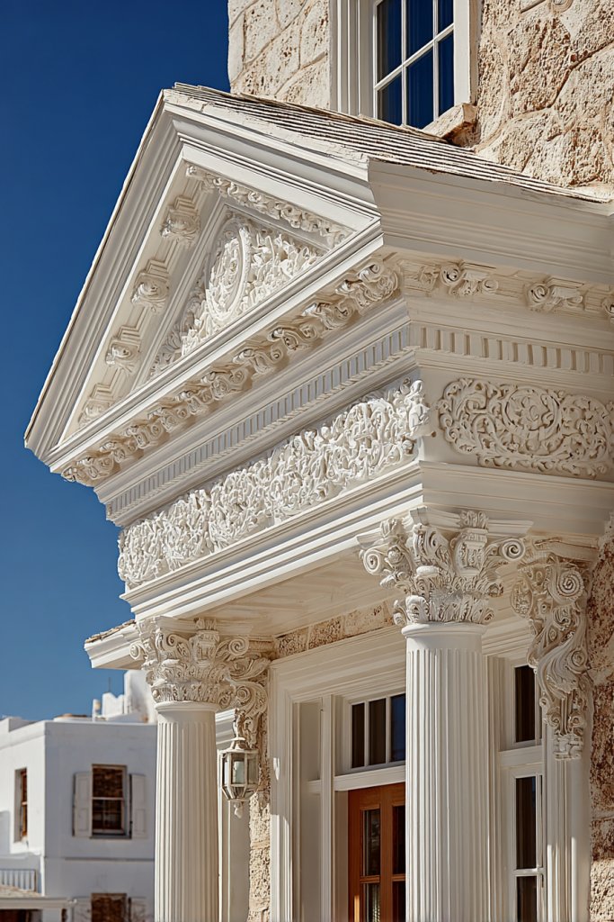 Add decorative medallions, floral motifs, or custom carvings for a personalized touch. Use contrasting colors or metallic finishes to highlight details. Incorporate lighting to showcase architectural features at night. Seasonal accents or wreaths can complement the overall look.