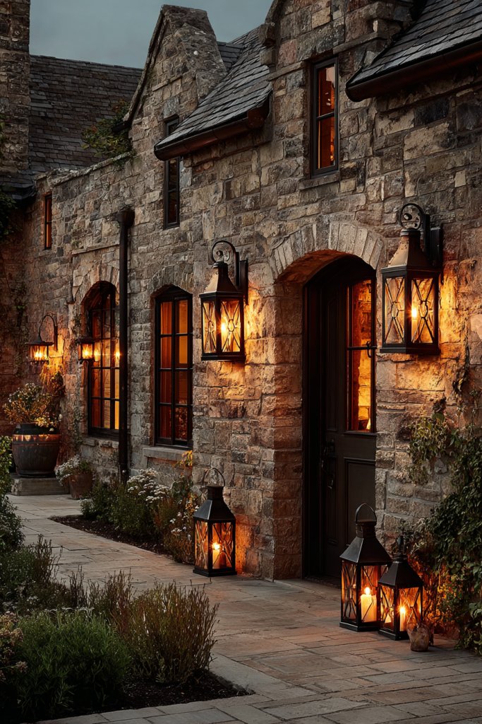 Add decorative elements like vintage-inspired lanterns or sleek modern sconces. Incorporate dimmable features to adjust ambiance. Use fixtures with unique finishes—antique bronze, matte black, or brushed nickel—to complement your exterior palette. For a cozy touch, place candles or flameless lanterns on porches.