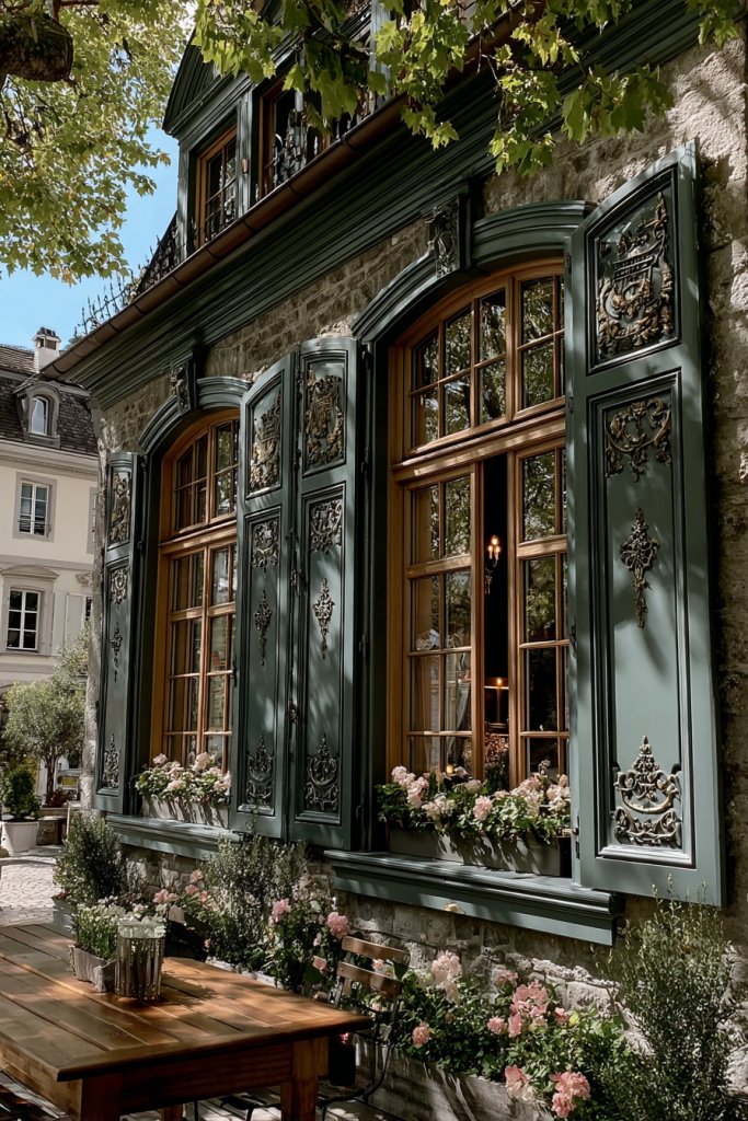 Visualize traditional wood shutters painted in a bold color that frames the window perfectly. Or imagine louvered shutters adding a classic touch, casting shadows across the glass. Shutters with decorative carvings or ornate hinges turn simple windows into focal points. When closed, they add a charming, cottage-like appeal.