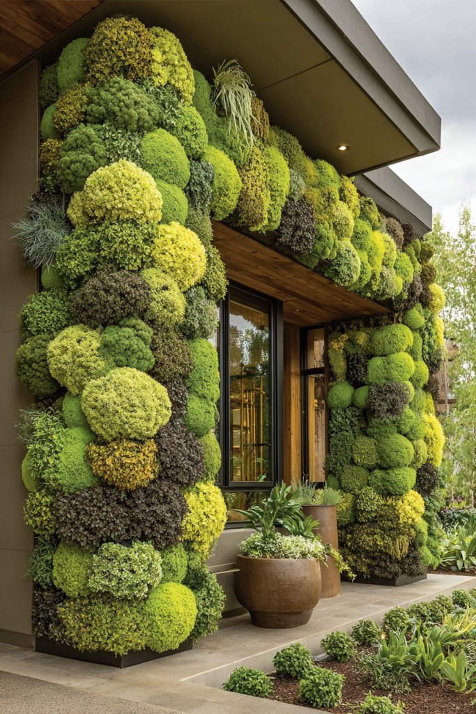 Imagine a textured wall covered in a mosaic of succulents or climbing vines. The vibrant greens contrast beautifully with neutral siding or stone accents. Vertical gardens can be designed with modular panels or pocket planters, creating a living piece of art. The interplay of textures and colors makes your exterior dynamic and engaging.