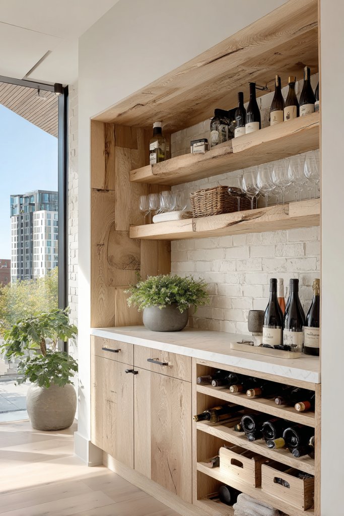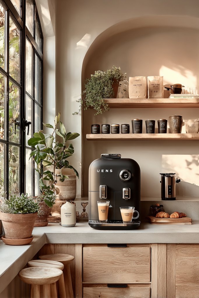 Visualize a sleek counter with a coffee maker, a few stylish mugs, and a small shelf for syrups or spices. Add a wine rack or mini fridge nearby for drinks, and a decorative tray for accessories. Warm lighting, textured backsplashes, or a bold accent wall tie the space together. It’s an inviting nook that makes every day feel special.