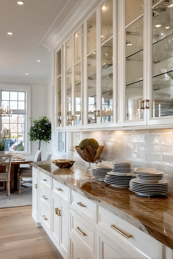 Hiding all your dishes in closed cabinets makes your kitchen look dull and cluttered. Glass-front cabinets offer a stylish way to display your beautiful kitchenware while adding depth to your space. They turn everyday items into decorative elements, making your kitchen more inviting.