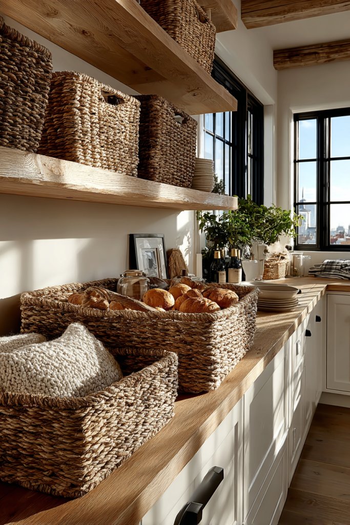 Imagine woven baskets in natural or painted finishes placed on open shelves or under countertops. They hold fruits, bread, or kitchen tools, creating a cozy, rustic vibe. The varied textures and earthy tones add visual interest and soften the overall look. When filled with fresh produce or colorful utensils, they become eye-catching accents.