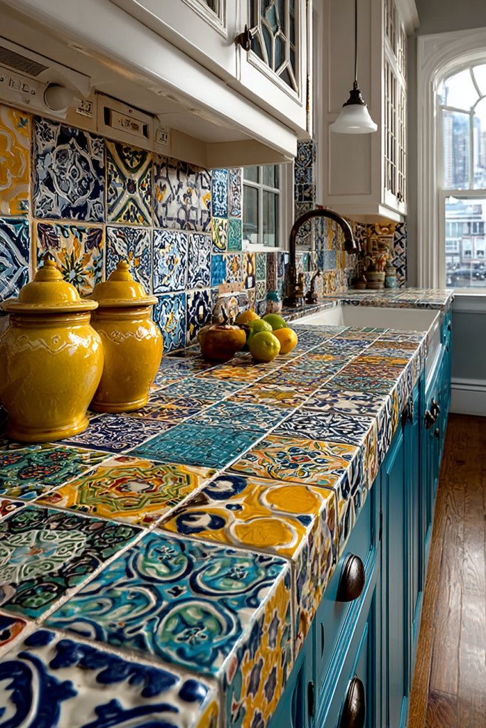 Picture vibrant tiles with intricate patterns in shades of blue, terracotta, or bold monochromes. The textured surface catches the light, creating a lively visual rhythm. The pattern draws your eye across the wall, making the space feel more dynamic. It pairs beautifully with sleek countertops and minimalist cabinetry, balancing modern and traditional aesthetics.