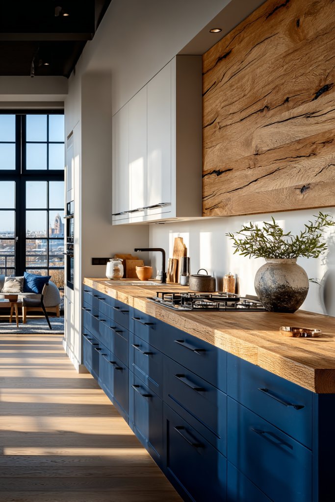 Picture a butcher block or reclaimed wood countertop with visible knots and grain patterns. The rich, warm tones contrast beautifully with sleek, modern cabinetry and shiny hardware. Light reflects softly off the wood’s surface, adding a glow that invites you to linger. The imperfections in the wood tell a story, making your kitchen feel authentic and lived-in.