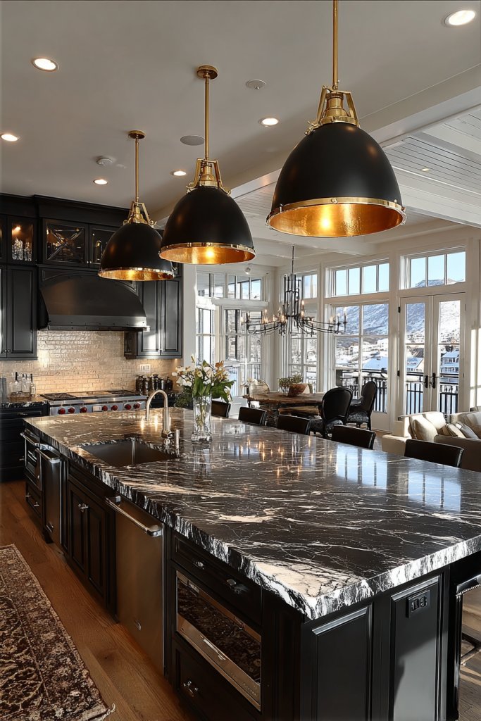 Imagine hanging a cluster of oversized, sculptural pendant lights above a sleek island with a marble countertop. The fixtures feature interesting shapes, textures, or metallic finishes that catch the eye. The warm glow from the pendants creates cozy pools of light, highlighting the island as the room’s centerpiece. This setup combines function with high-style design.