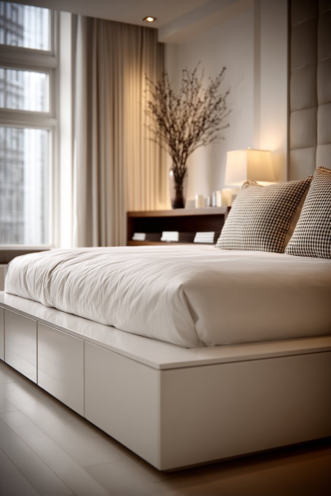 Looking for a bedroom that feels sleek and uncluttered? A modern low-profile bed with a slim metal frame offers just that. It emphasizes clean lines and a minimalist aesthetic, making the space appear larger and more open. Perfect for contemporary decor lovers.