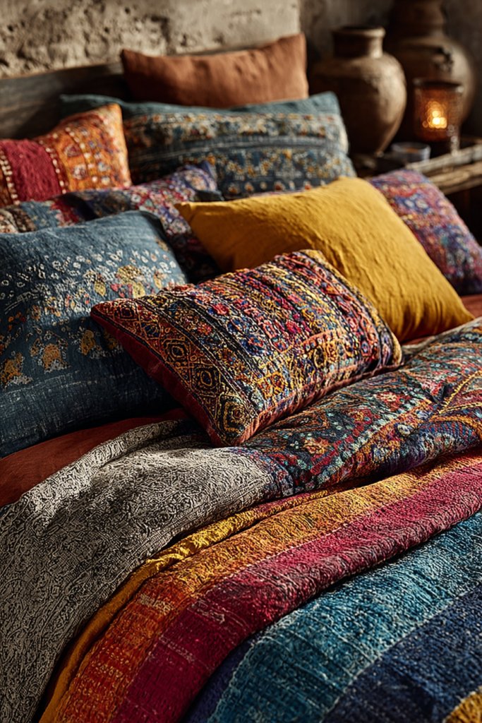 Visualize a bed adorned with a mix of vibrant throws, embroidered cushions, and patterned quilts. Rich, earthy tones like terracotta, deep reds, and jewel shades dominate the scene. Tassels, fringes, and mixed prints add depth and movement. The overall look is inviting, energetic, and full of personality.