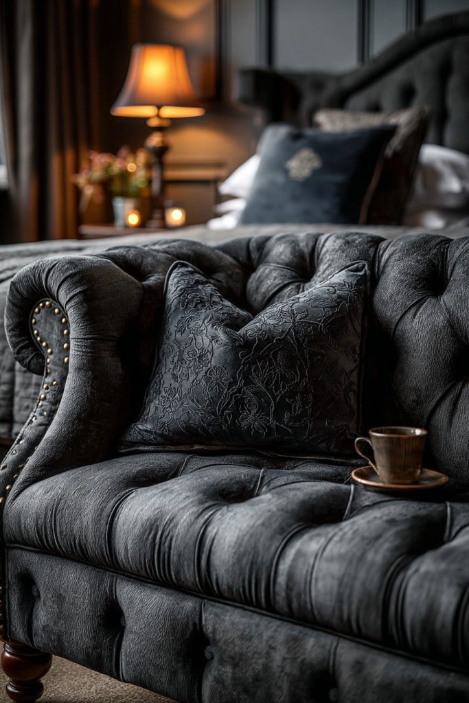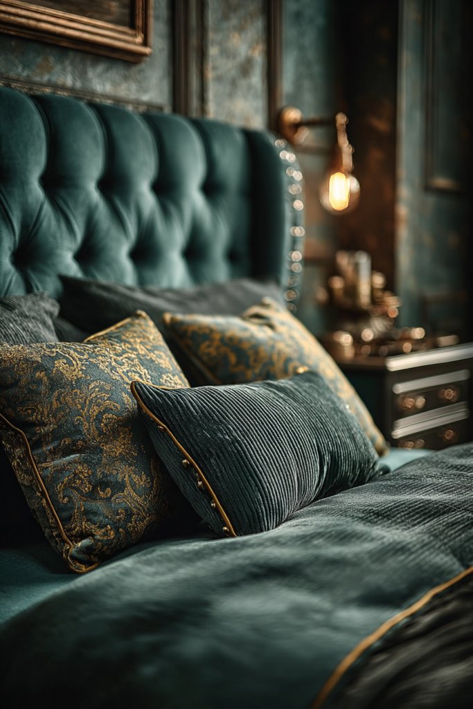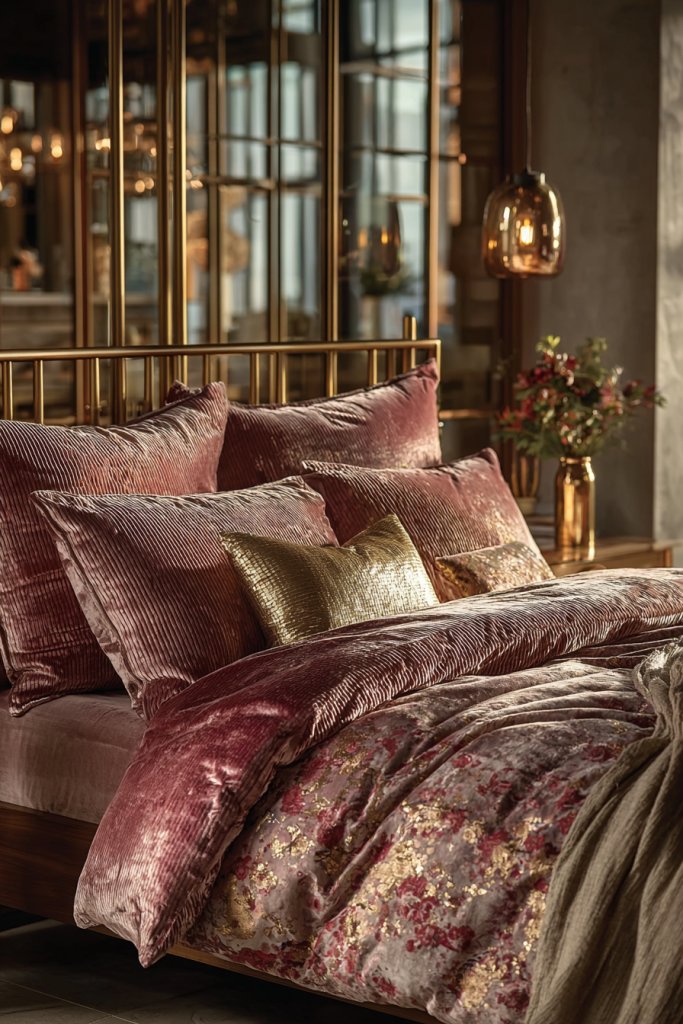 Dreaming of a bedroom fit for a boutique hotel? A luxe velvet bed with a metallic frame and matching bedding accents elevates your space instantly. It’s a glamorous centerpiece that combines texture and shine. Perfect for creating a stunning, sophisticated retreat.