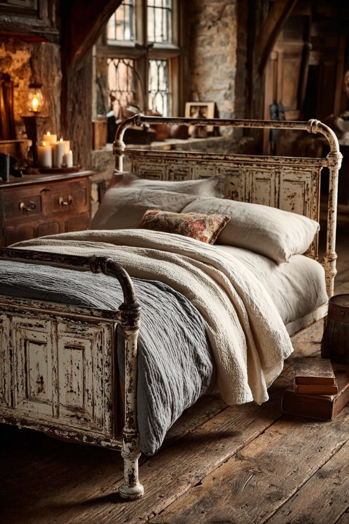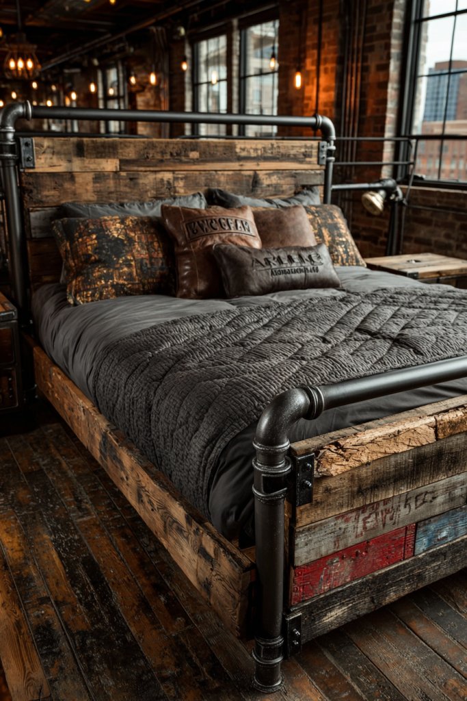 Visualize a sturdy black metal frame paired with distressed wood panels at the headboard. The raw textures and imperfect finishes evoke a sense of history and craftsmanship. Exposed bolts and metalwork add an industrial vibe, while warm wood tones soften the look. Ambient lighting and vintage-inspired accessories complete the scene.